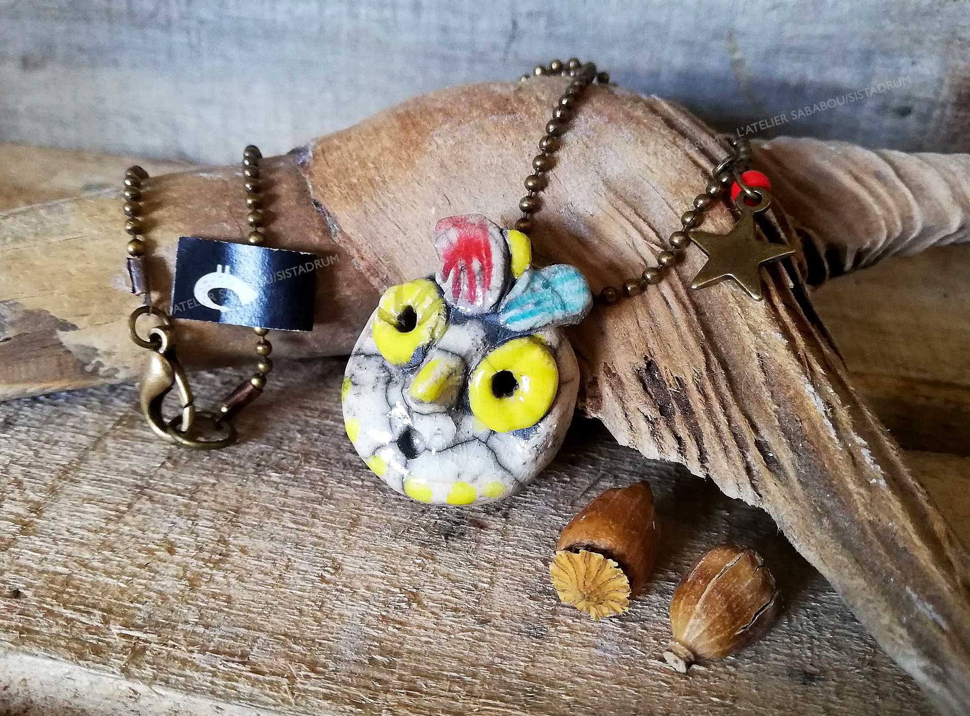 Composition : Chouette en terre (argile). Email. Chaine boules et étoile en laiton vieilli. Petite perle en rocaille rouge. Fabrication artisanale et matière 1ère/France.