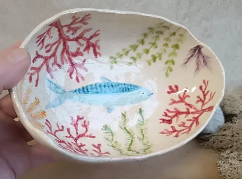 Plongez dans les océans en vous émerveillant des fonds marins. Cette fine création, toute lisse et ronde, est modelée à la main sans outils. Elle est ensuite peinte avec 3 passages d’émaux multicolores. La pose est faite au pinceau avec une extrême délicatesse. Cette poterie est un modèle unique. Vous pouvez le décorer avec une jolie plante par exemple.