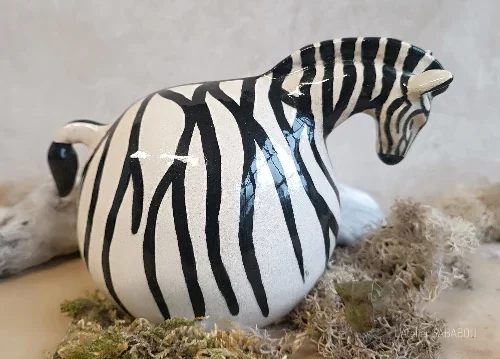 Cette sculpture est un modèle unique entièrement réalisé à la main, sans machines. L’émail est posé au pinceau très délicatement pour obtenir un noir intense sur les rayures. Deux à trois passages sont nécessaires. La boule est creuse pour résister aux deux cuissons dans le four de potier à l’atelier. La sculpture est signée.