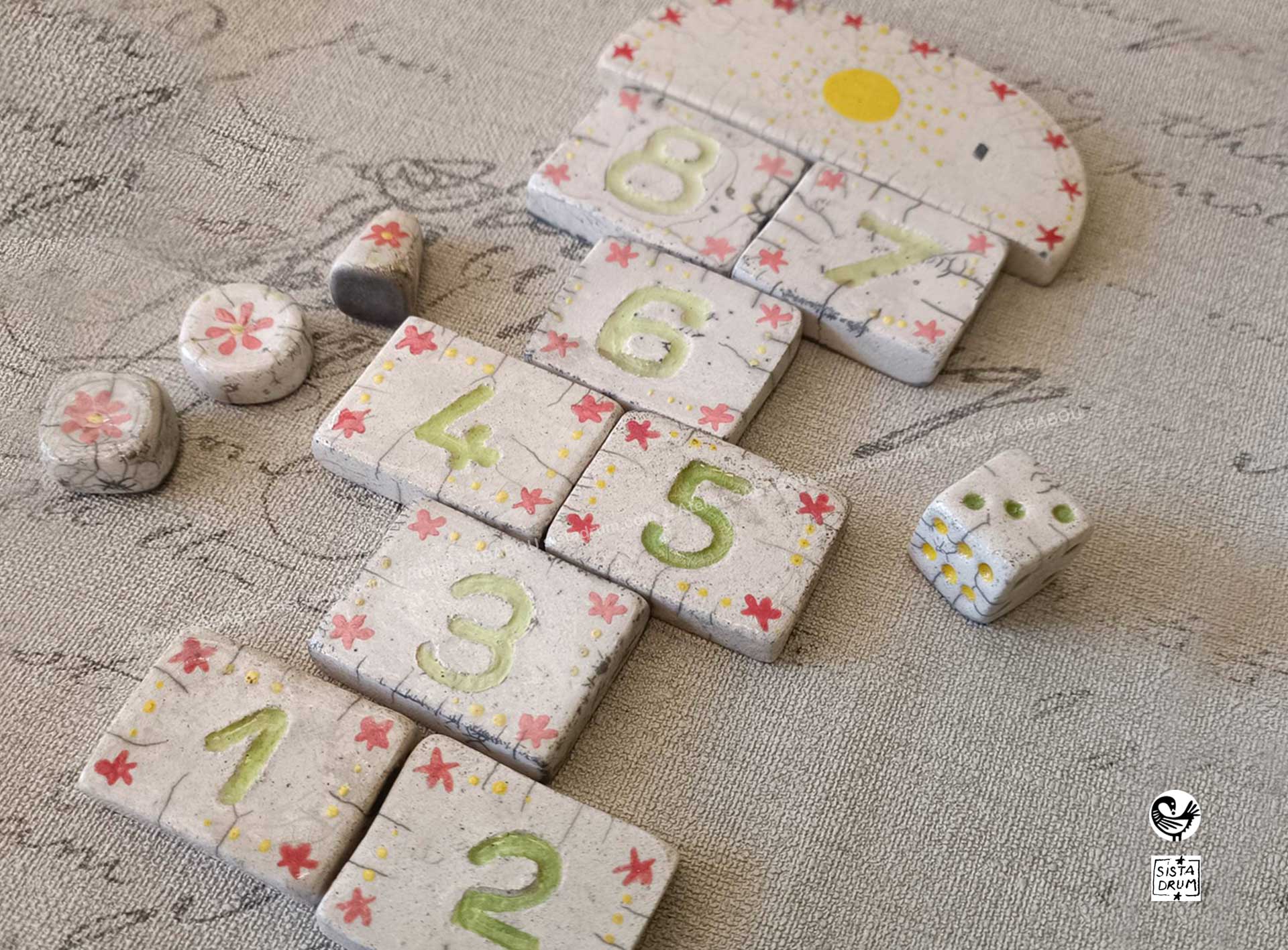 La marelle, ou palet, est un jeu enfantin pratiqué, le plus souvent, dans la cour de récréation. Cette marelle est à emporter partout ! Travail artisanal, tout est réalisé à la main et peint délicatement. Pour 3 joueurs. Lancez le dé tour à tour, le premier arrivé tout en haut « pile poil » a gagné. Vous n’avez pas le nombre de points suffisants pour arriver directement au soleil? Redescendez et passez votre tour.